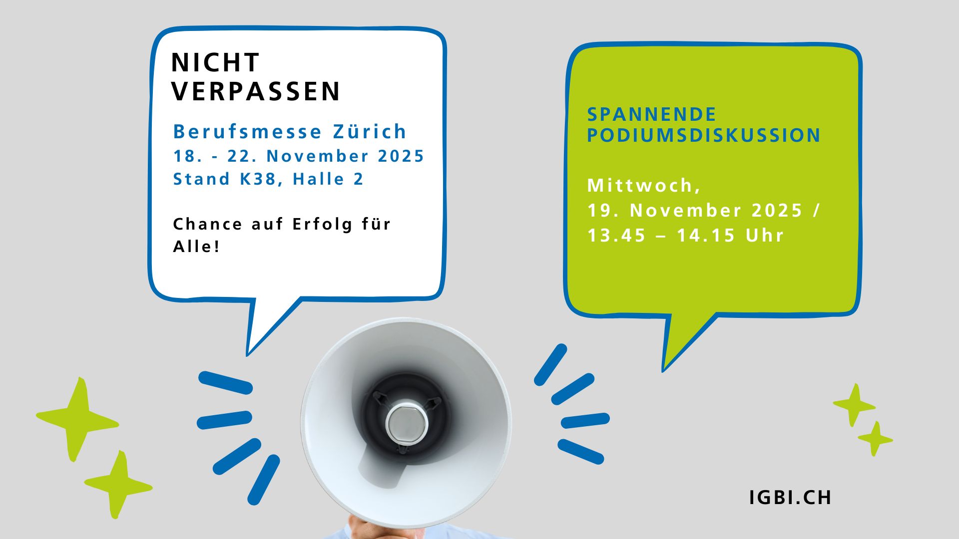Besuchen Sie uns an der Berufsmesse Zürich vom 18.11. – 22.11.2025 am Stand K38, Halle 2 und erfahren Sie alles über die Ausbildungsangebote für Personen mit besonderem Bildungsbedarf. Wir freuen uns, Sie persönlich kennen zu lernen.